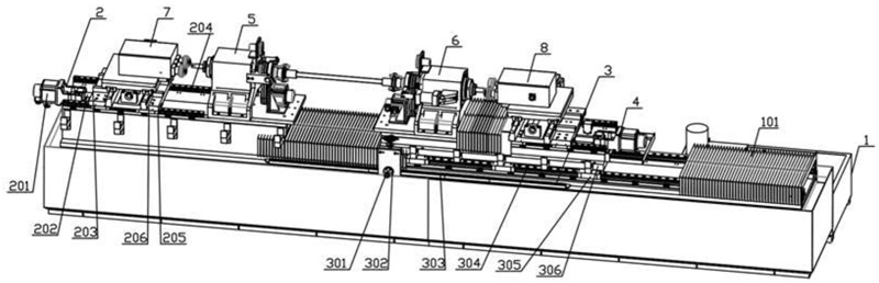 為了解決上述問(wèn)題,本實(shí)用新型的目的在于提供了一種磨削效率高、管體兩端直線度好、適用不同長(zhǎng)度的管體磨削和開(kāi)環(huán)形槽的碳化硅管體雙頭打磨車(chē)床。