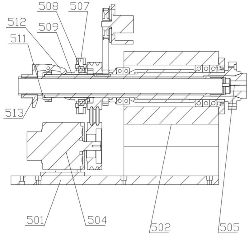在一些實(shí)施方式中,第一夾持部包括第四安裝板、主軸箱、附加夾頭和旋轉(zhuǎn)驅(qū)動(dòng)件,主軸箱設(shè)置在第四安裝板上,主軸箱遠(yuǎn)離卡盤(pán)的一側(cè)設(shè)有附加夾頭,旋轉(zhuǎn)驅(qū)動(dòng)件驅(qū)動(dòng)主軸箱。