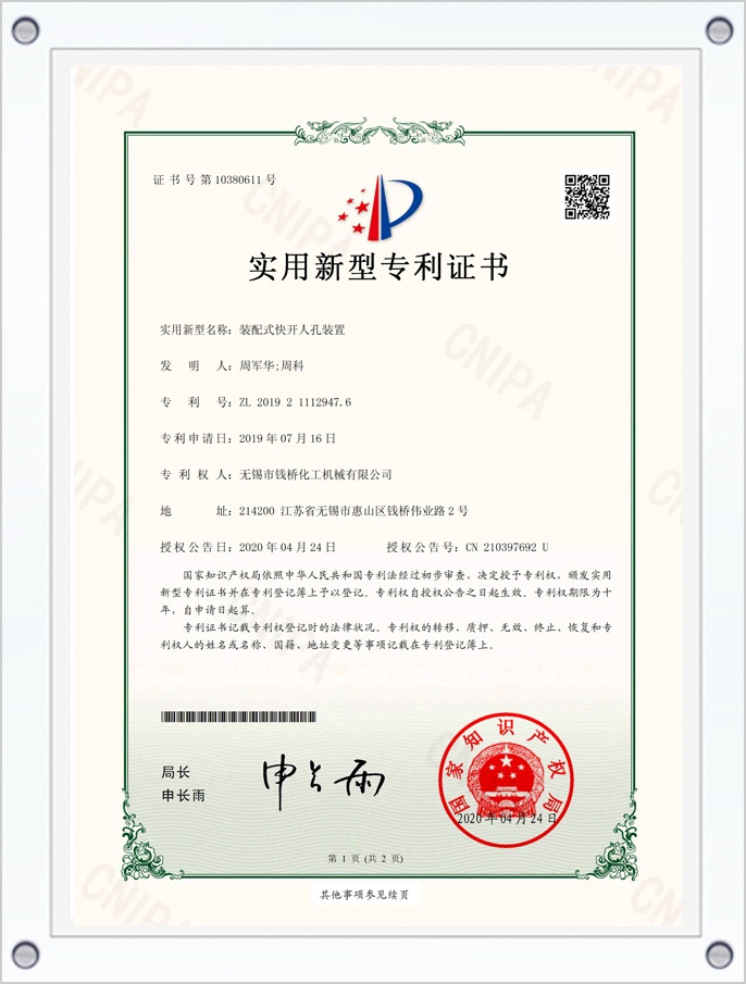 裝配式快開人孔裝置專利證書